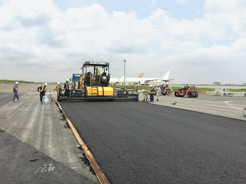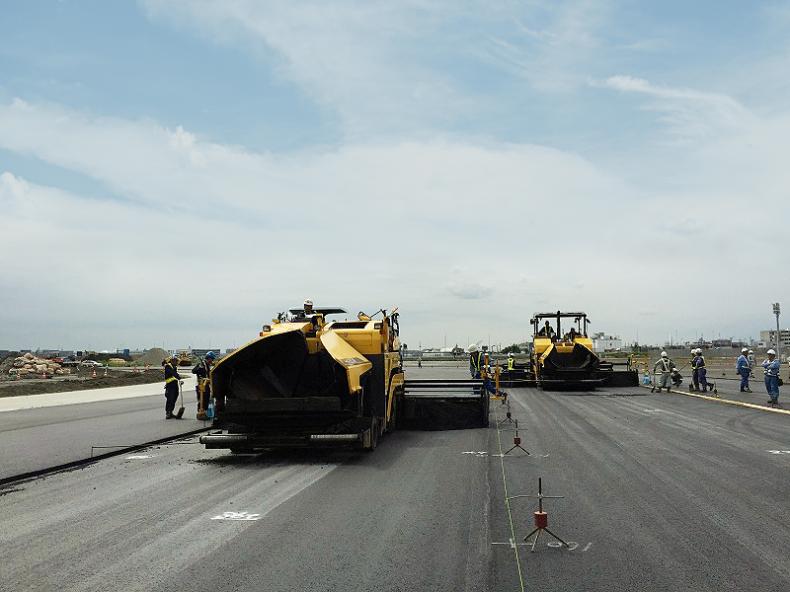 本次在东京国际机场(羽田机场)的道路摊铺作业现场,并排使用HA90C-2和HA60W-8 (所用摊铺宽度为4.5m)进行摊铺。这种摊铺方式被称为联合摊铺方式,有的作业现场通过这种摊铺方式实现了一次性12m的摊铺宽度。