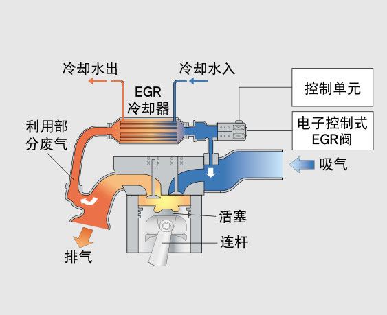 冷却式废气再循环(EGR)系统 采用冷却式EGR系统,获得进一步减少NOx(氮氧化合物)的效果。其做法是在对排放的气体再循环以降低燃烧温度的EGR(Exhaust Gas Recircu-lation)上设置水冷式冷却器。 |