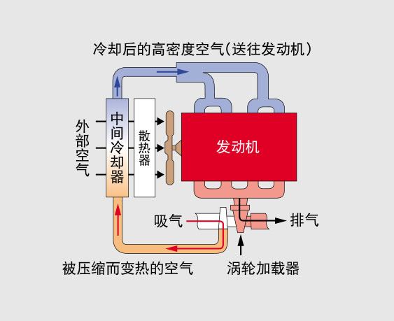 带中冷器的涡轮发动机 吸入的空气在涡轮加载器的压缩下形成高温,经中间冷却器冷却后可提高吸入效率。在大幅度减少NOx和PM的同时,提高了输出功率,减少了油耗。 |