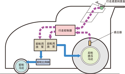 本系统起到了防止打滑和流畅起动的效果。由于能够控制反馈速度,因此使够使因负载变动而寻致的速度变化大幅减小。并在强大的牵引力作用下,实现了行走的稳定性。